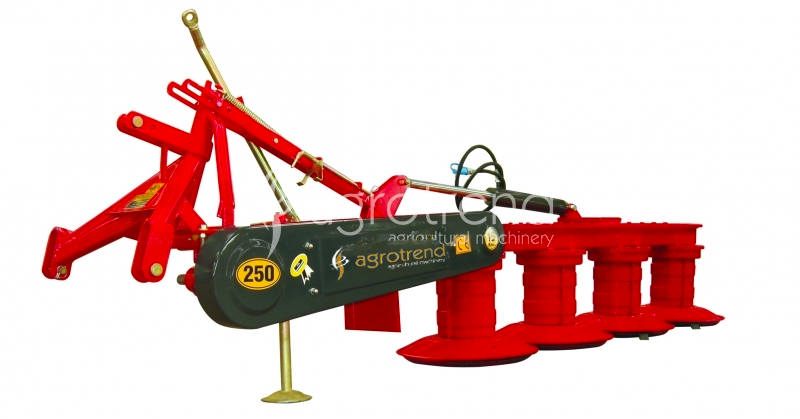 This is a mounted-type mower which is driven by tractor power take-off, and mows any kind of feeding plants, grasses, pastures and herbs by means of reversely rotating drums each having 3 blades and which leaves the grass as swathe. It is manufactured in two types as hydraulic and mechanical.