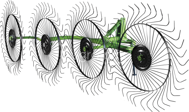 The wheel rake which is mounted to the rear side of the tractor with three-point hitch mechanism is used in gathering cut grass without damaging and smashing. It is manufactured as quartet, quintet, octuple and denary.
